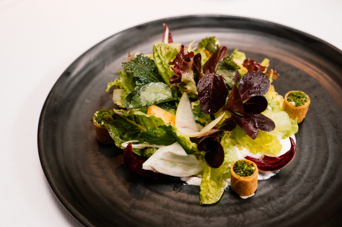 Em seguida, nós duas escolhemos uma salada de entrada, com folhas diversas, burrata e um croquant — rolinho crocante recheado com creme de manjericão. A salada já veio com um leve molho, gostoso, equilibrado e na quantidade certa, o que pra mim é um ótimo indício de um bom restaurante.
