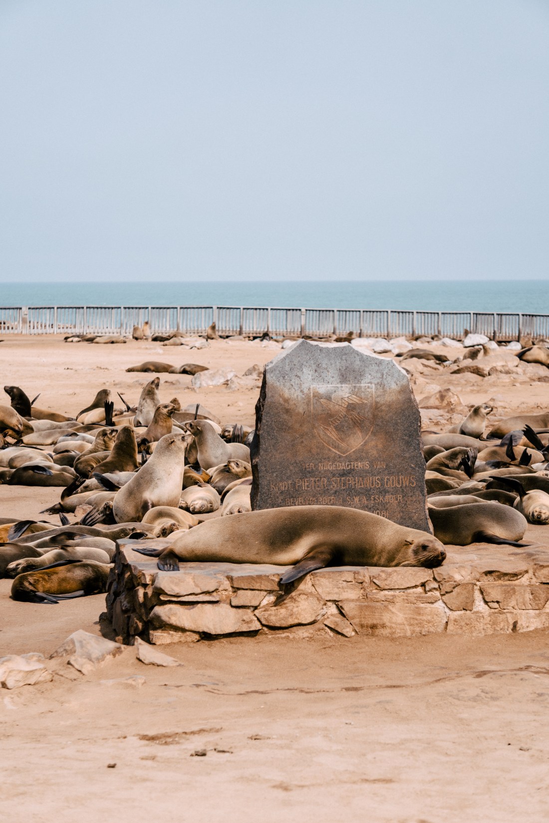 Cape Cross, perto de Henties Bay, é uma reserva natural onde se reproduz uma imensa colônica de lobos-marinho-do-cabo, e quando digo imensa, falo de 200.000 a 250.000 lobos-marinhos… Conseguem imaginar o cheio do lugar? É pungente, mas apesar disso, é um ponto interessante para se visitar entre Swakpmund e a Costa do Esqueleto, pois é possível se aproximar bastante dos bichos para observá-los e fotografá-los, o contato já começa no estacionamento onde alguns lobos gostam de dormir ao sol. Acredito que eles estejam já acostumados com a presença humama e por isso não se perturbam muito conosco, o que não é sempre o caso com esses animais.