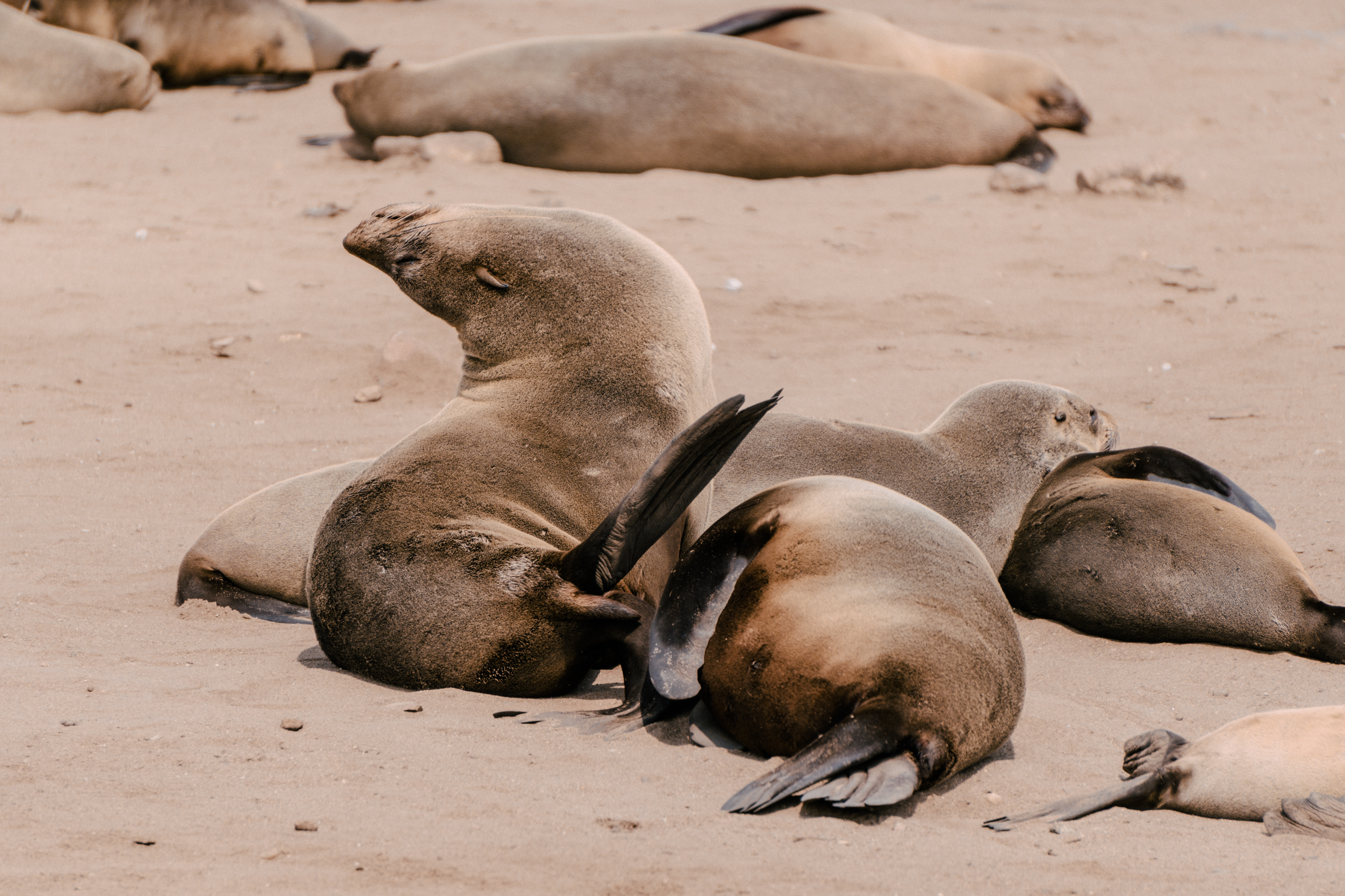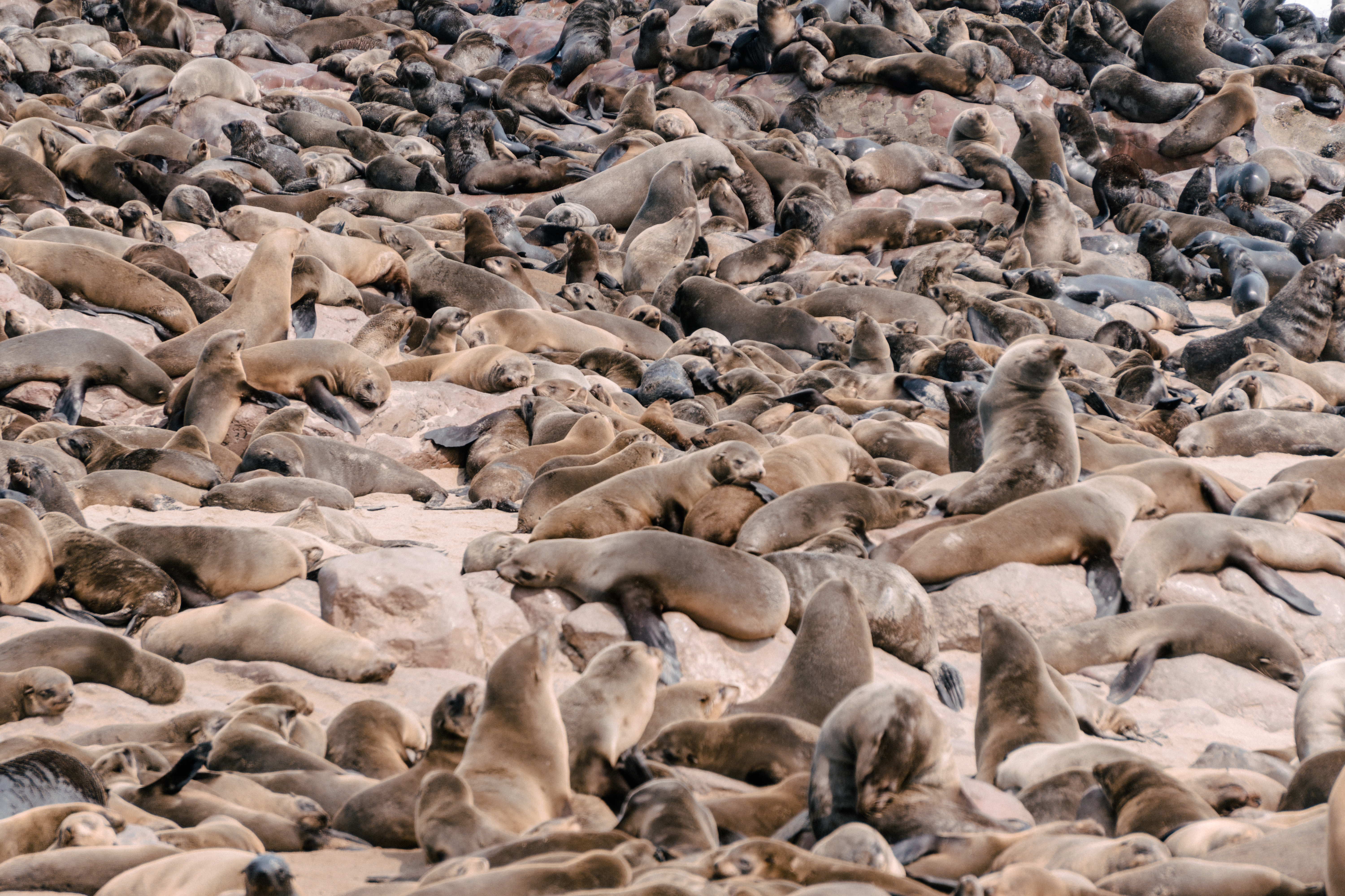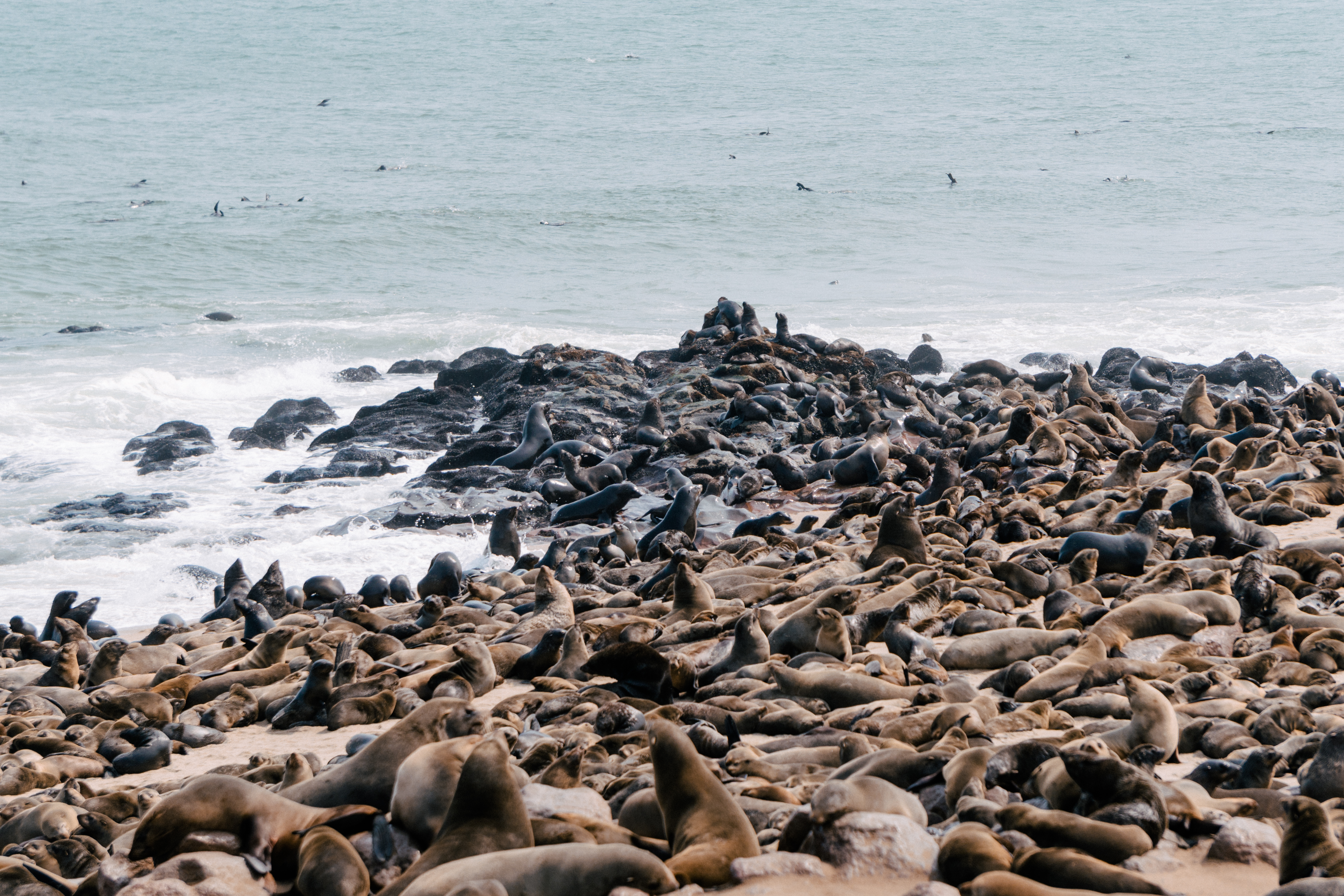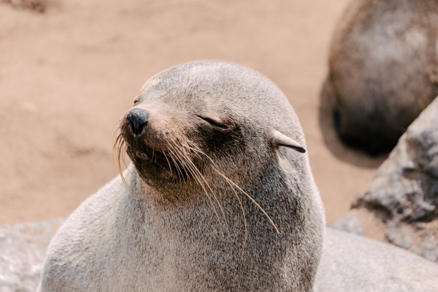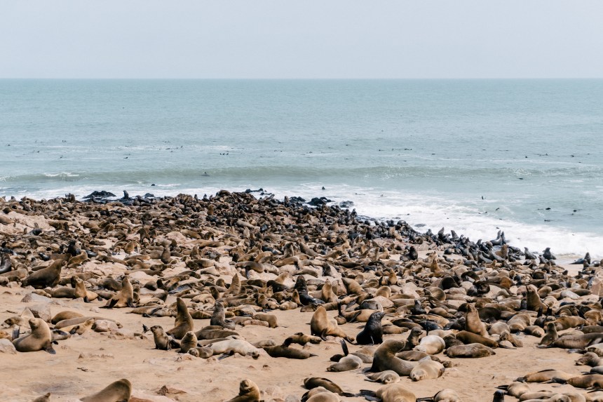 Os lobos-marinhos-do-cabo, presentes na África e na Austrália, são os maiores entre os lobos-marinhos e se caracterizam pela pelagem marrom, orelhas pequenas e longos bigodes. Vivendo grande parte da vida na água, eles ficam em terra quando estão se reproduzindo, preferindo encostas e praias rochosas à areia. São animais extremamente vocais, por isso, além do cheiro característico, os sons do local são peculiares: para se comunicar entre si os lobos gritam em diversas entonações, que variam entre parecer que estão vomitando a parecer que estão rindo. É bem engraçado presenciar as interações entre eles, pois os bebês estão sempre buscando onde mamar, mas nem sempre as lobas estão receptivas… Além deles, em Cape Cross também pode-se observar pequenos coiotes, muitas gaivotas e eventualmente hienas marrons que vivem na costa.