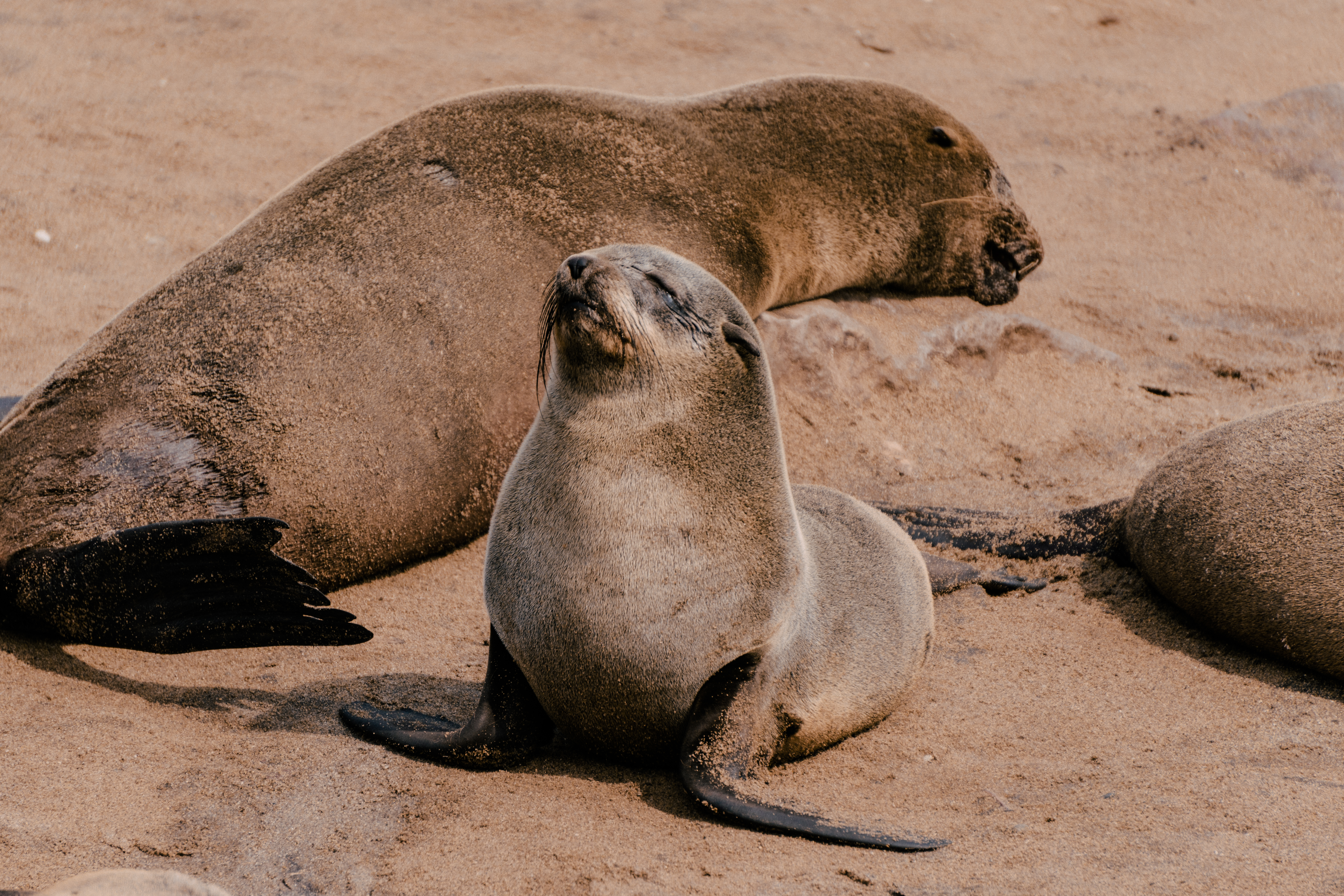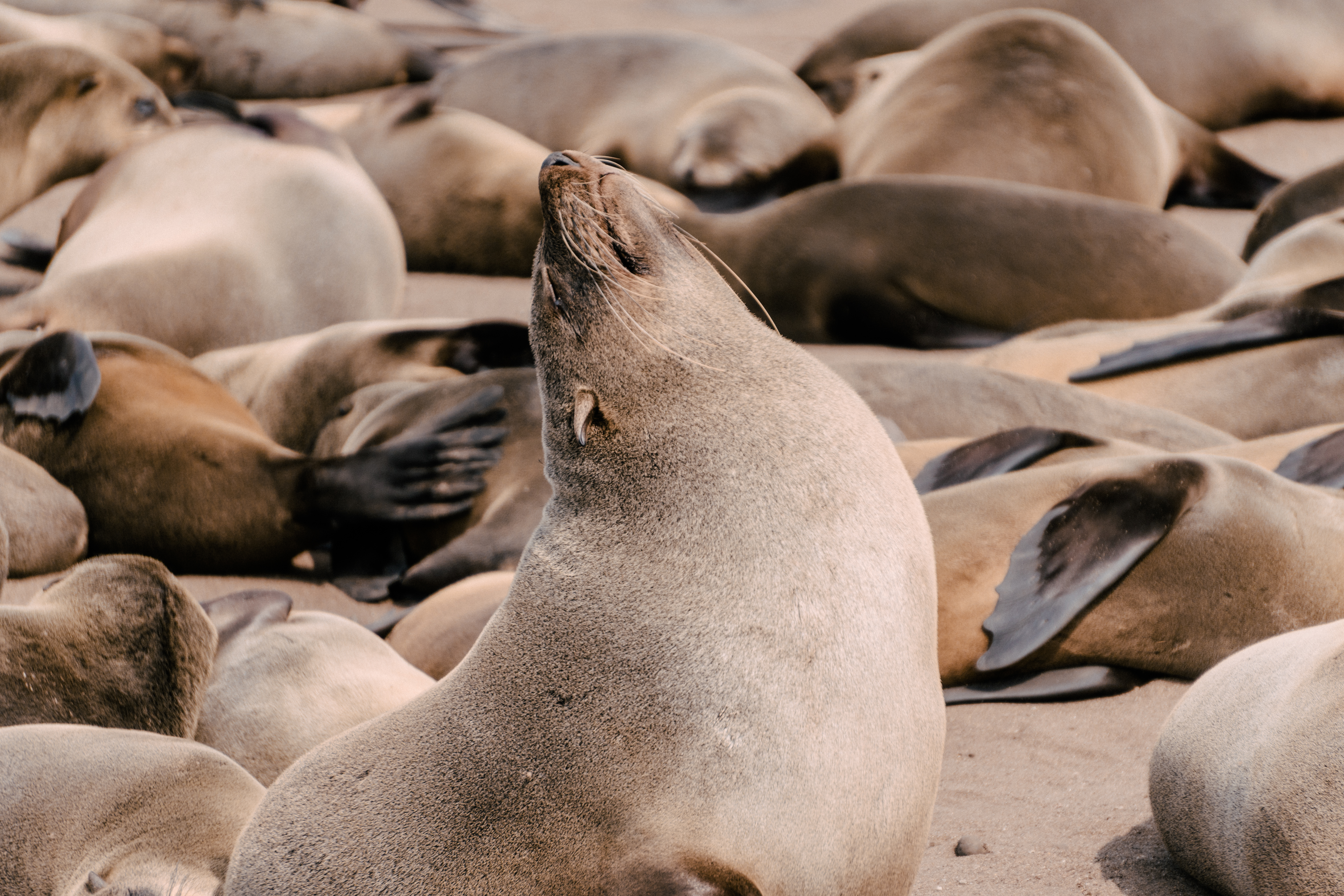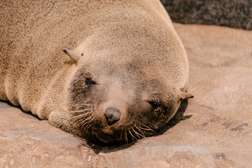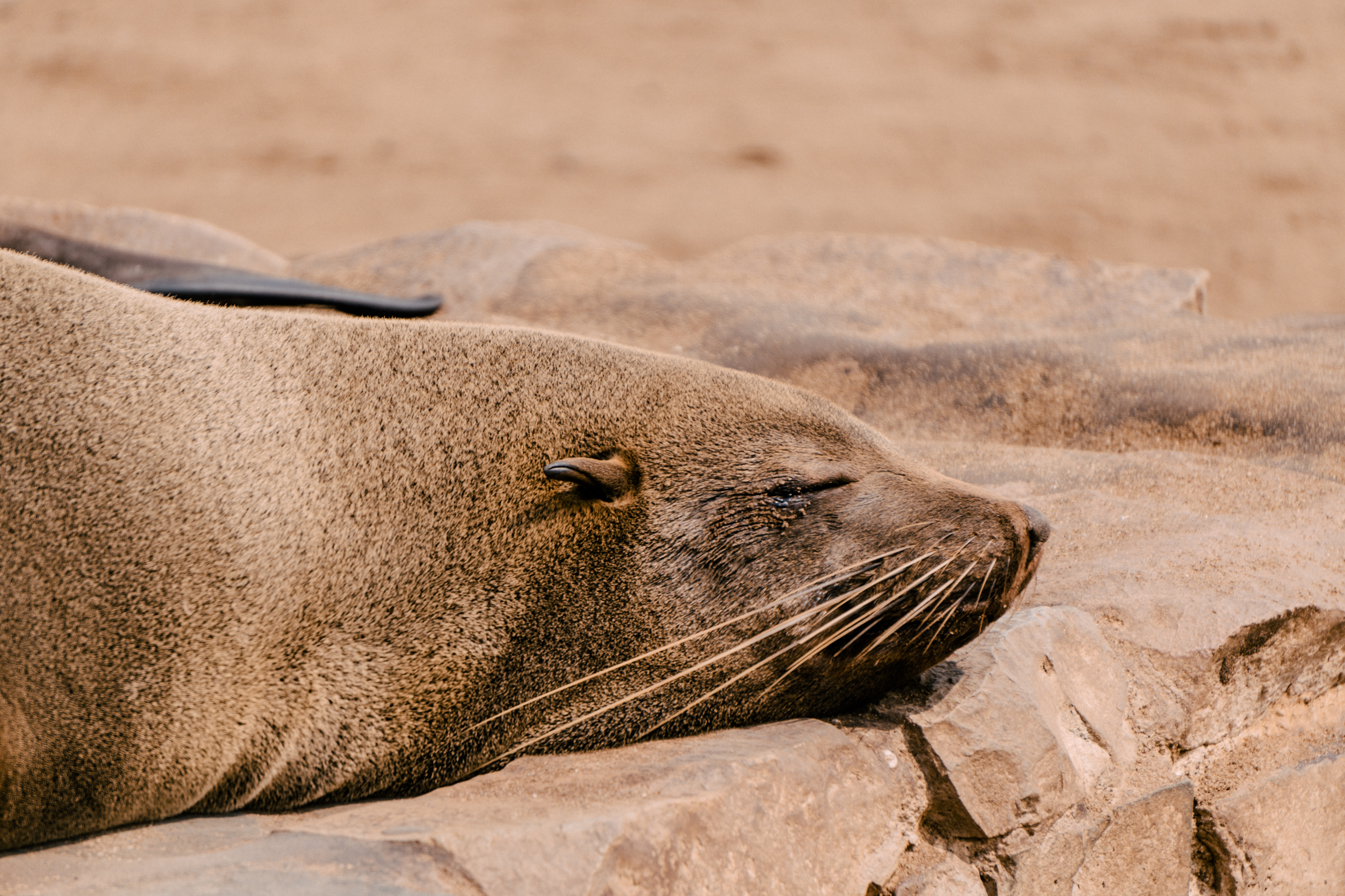 Os lobos-marinhos-do-cabo, presentes na África e na Austrália, são os maiores entre os lobos-marinhos e se caracterizam pela pelagem marrom, orelhas pequenas e longos bigodes. Vivendo grande parte da vida na água, eles ficam em terra quando estão se reproduzindo, preferindo encostas e praias rochosas à areia. São animais extremamente vocais, por isso, além do cheiro característico, os sons do local são peculiares: para se comunicar entre si os lobos gritam em diversas entonações, que variam entre parecer que estão vomitando a parecer que estão rindo. É bem engraçado presenciar as interações entre eles, pois os bebês estão sempre buscando onde mamar, mas nem sempre as lobas estão receptivas… Além deles, em Cape Cross também pode-se observar pequenos coiotes, muitas gaivotas e eventualmente hienas marrons que vivem na costa.