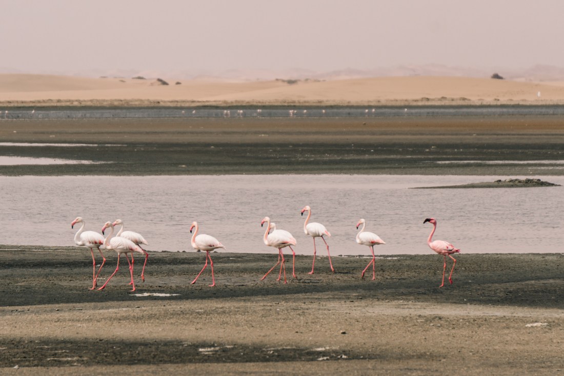 Próximo a Swakopmund – a 40 minutos de distância, o que para os padrões da Namíbia é do lado – fica Walvis Bay, uma cidade portuária conhecida pelas suas salinas e pelos flamingos que habitam a região. O local mais conhecido para ver os flamingos é a Walvis Bay Lagoon, que fica na orla da cidade, mas seguindo a estrada de sal para dentro da região das salinas eles também estão presentes e não vimos nenhum outro turista. Independente da presença dos flamingos, vale visitar a região das salinas pelas paisagens quase alienígenas, onde a presença humana é pontuada por construções ou veículos solitários perdidos no meio de tons pastel, um fundo infinito onde o céu acinzentado da Namíbia se mescla com os finos planos de água que cobrem as jazidas de sal.